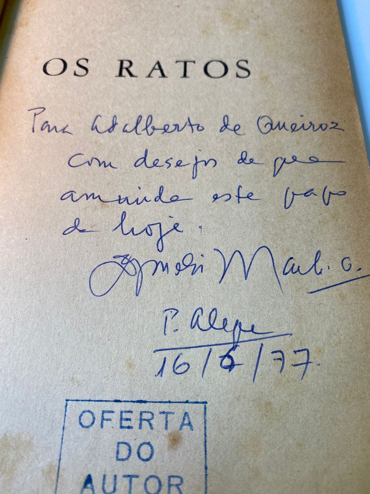 Quando conheci o escritor gaúcho Dyonelio Machado, tinha ele 82 anos e estava aprendendo Grego. Ele me dedicou seu romance “Os ratos” assim.